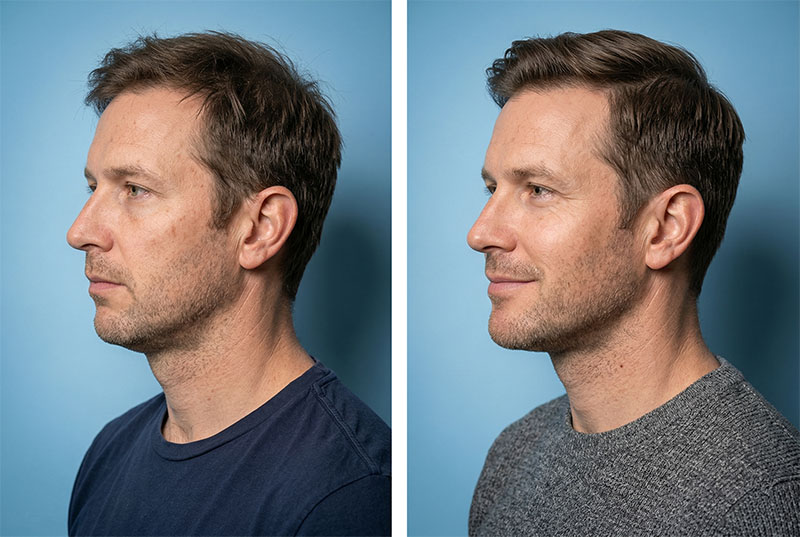 Nach einer Kinnkorrektur mit Implantat können Sie ein harmonischeres und ausgewogeneres Gesichtsprofil erwarten. Das Kinnimplantat verleiht dem Kinn mehr Projektion und Definition, was sich positiv auf die gesamte Gesichtsästhetik auswirkt.